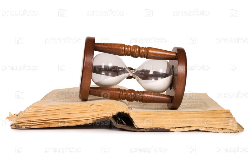 Песочные часы и книга, изолированы на белом фоне
