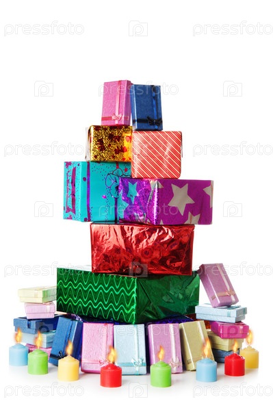 Куча подарков, окруженная горящими свечами