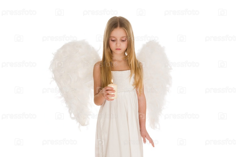 Изображение симпатичной девушки с белыми крыльями за спиной, которая смотрит на зажженную свечу в руках