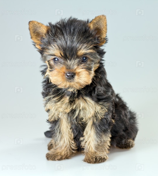 Маленький щенок йоркширского терьера на светло-сером фоне