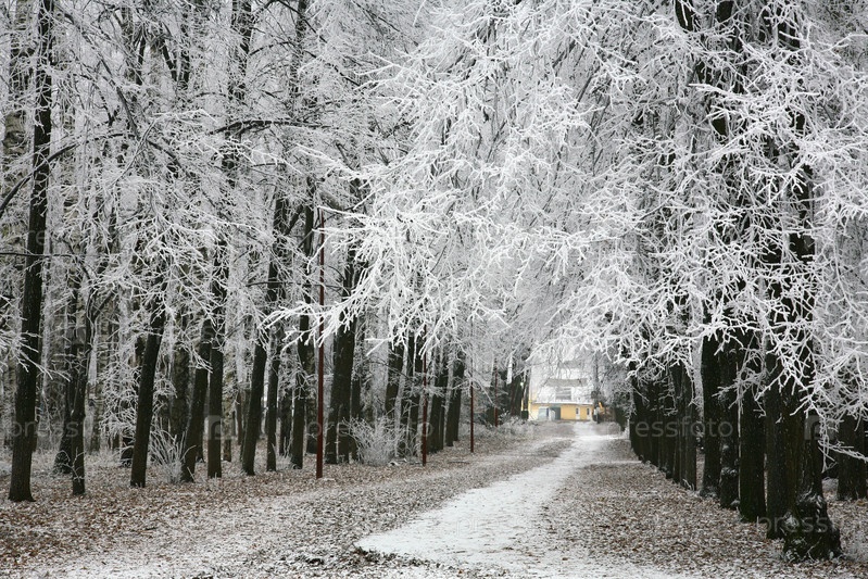 Заснеженные деревья в осеннем городском парке