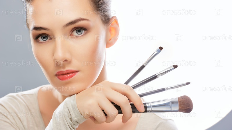 Портрет красивой женщины с кистями для макияжа