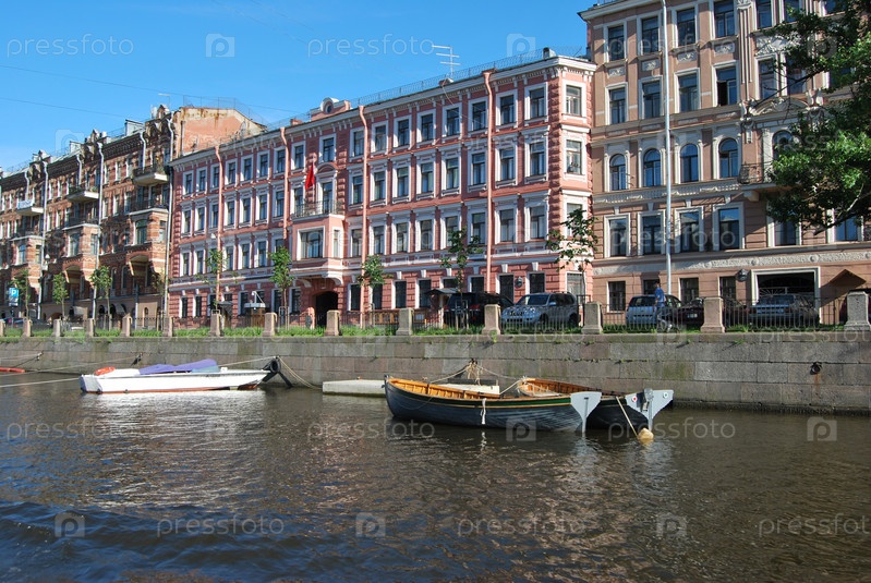 Лодки на реке и набережная города