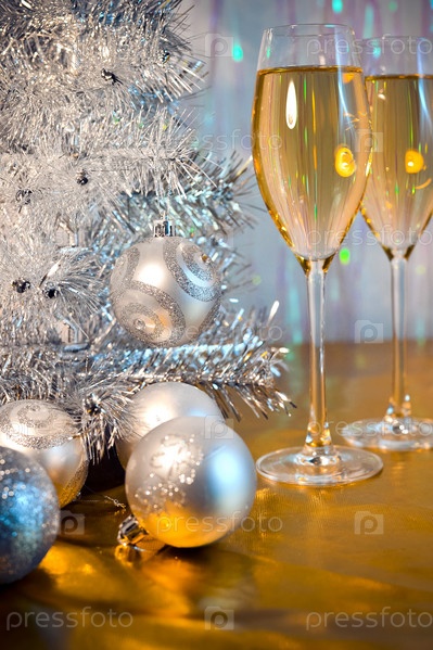 Новогодние игрушки и бокалы с шампанским на столе