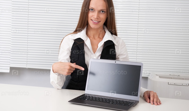 Бизнес-леди указывает на экран ноутбука
