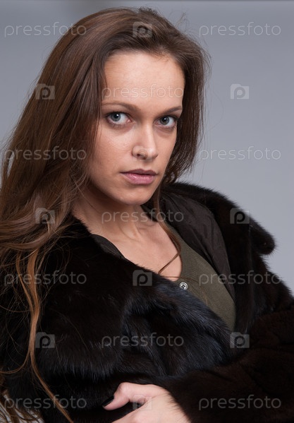 Красивая женщина в шубе на сером фоне