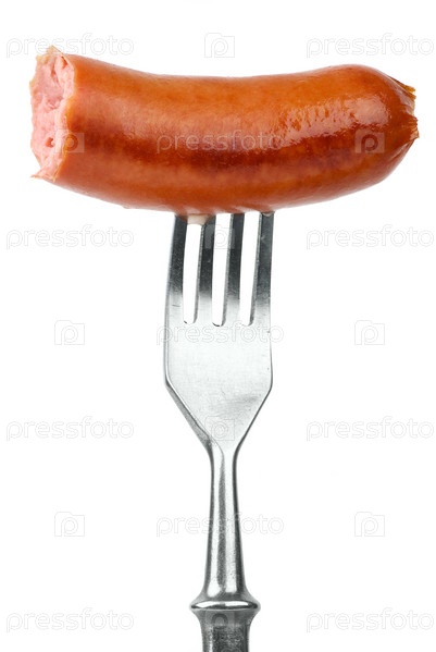 Надкушенная жареная сарделька, наколотая на вилку. Белый фон