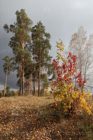 Осенний пейзаж с березами и соснами