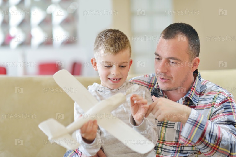 Отец и сын собирают игрушечный самолет