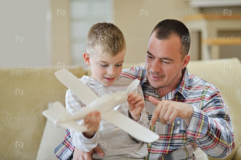 Отец и сын собирают игрушечный самолет