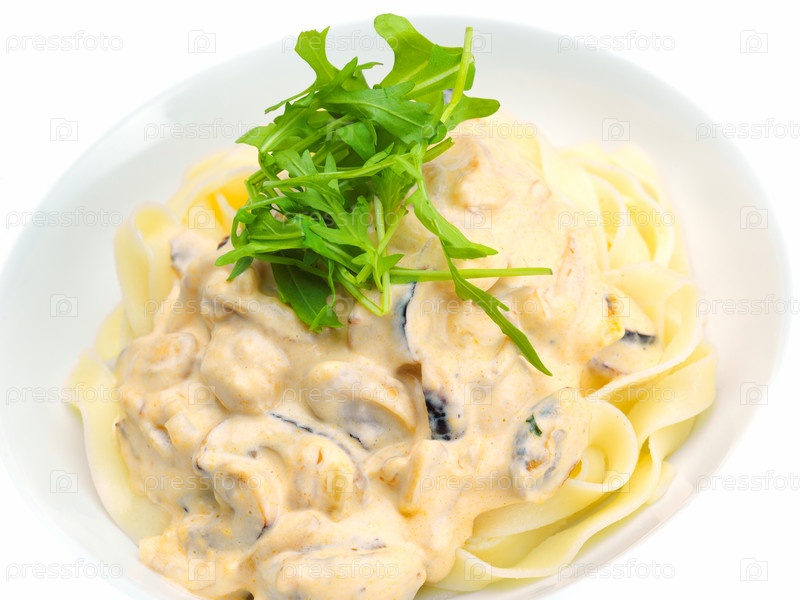 Макароны с креветками, зеленью и грибами