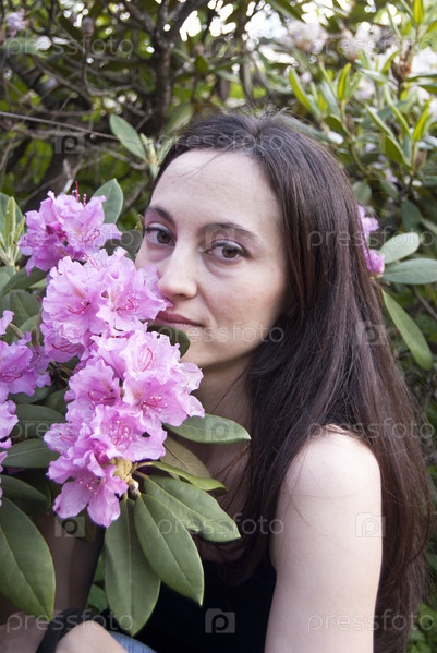 Девушка возле дерева с розовыми цветами