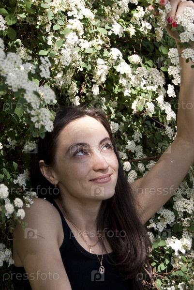 Девушка возле дерева с белыми цветами