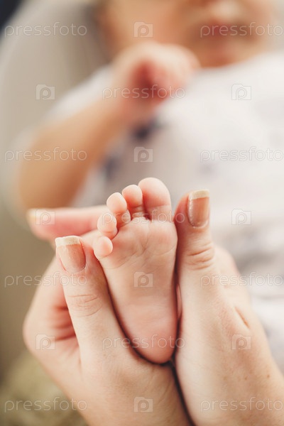 Рука массирует ногу новорожденного ребенка