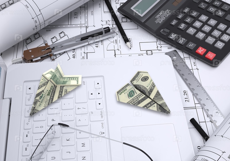 Бумажные самолетики на клавиатуре ноутбука. Рядом архитектурные чертежи и инструменты