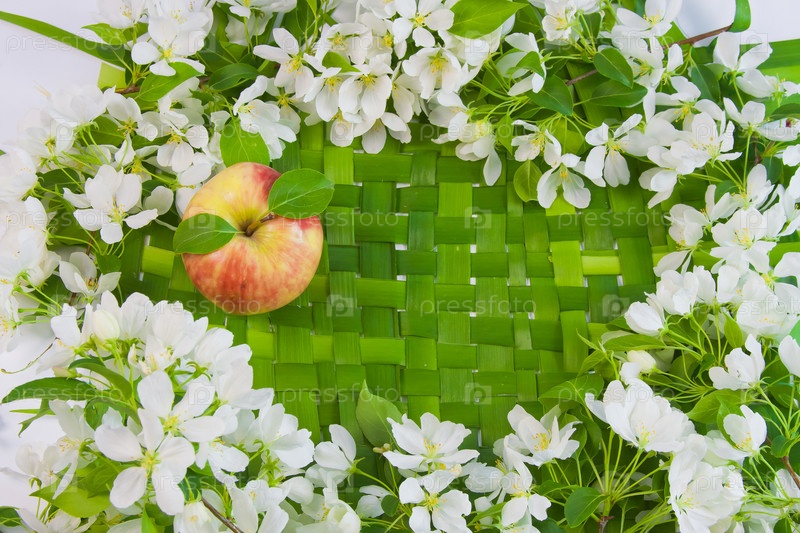 Яблоко с ветками цветущей яблони на зеленом фоне