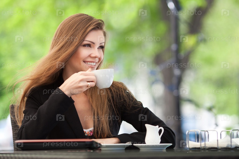 Женщина пьет кофе в кафе