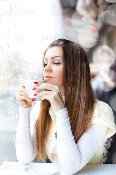 Красивая девушка пьет кофе в кафе