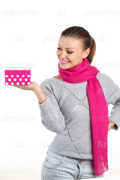 Красивая молодая женщина с подарочной коробкой