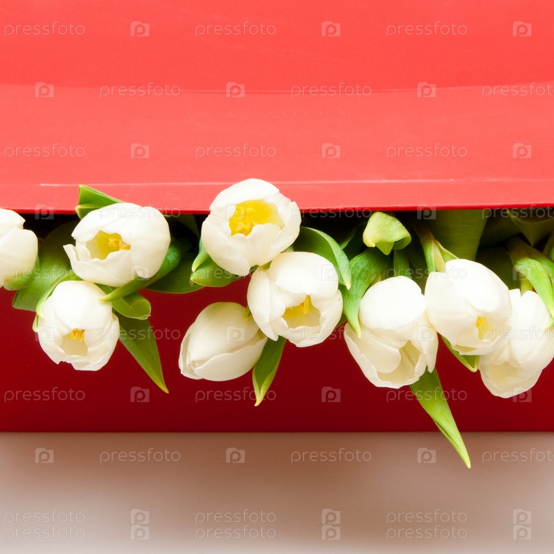 Белые тюльпаны в красной коробке