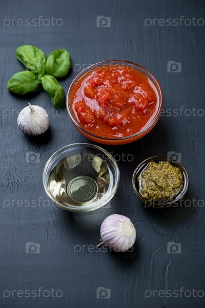 Помидоры, оливковое масло, песто и чеснок