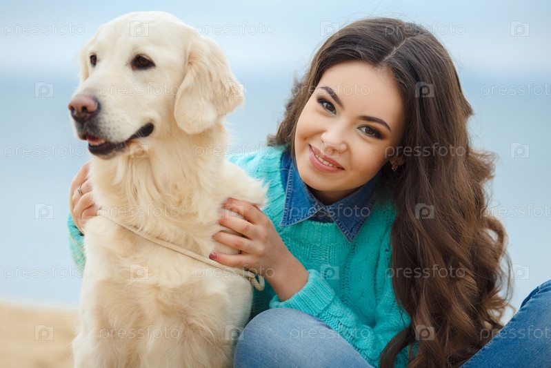 Красивая девушка с собакой у моря