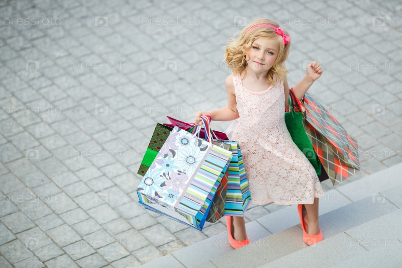 Маленькая девочка с покупками в торговом центре
