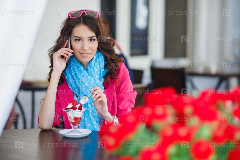 Молодая женщина в кафе с телефоном