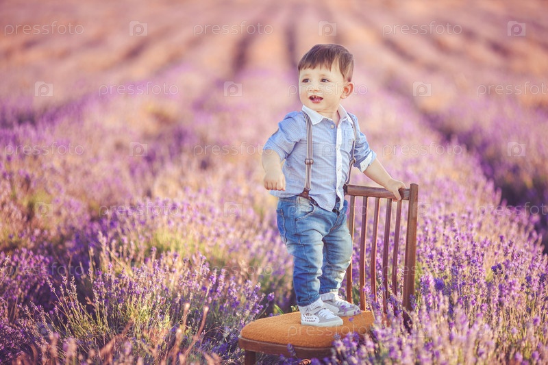 Мальчик играет на лавандовом поле