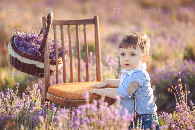 Мальчик играет на лавандовом поле