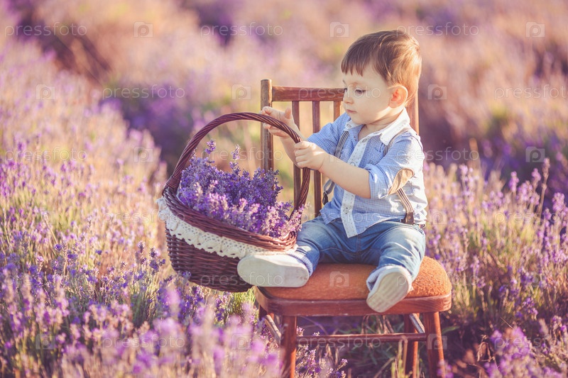 Мальчик играет на лавандовом поле