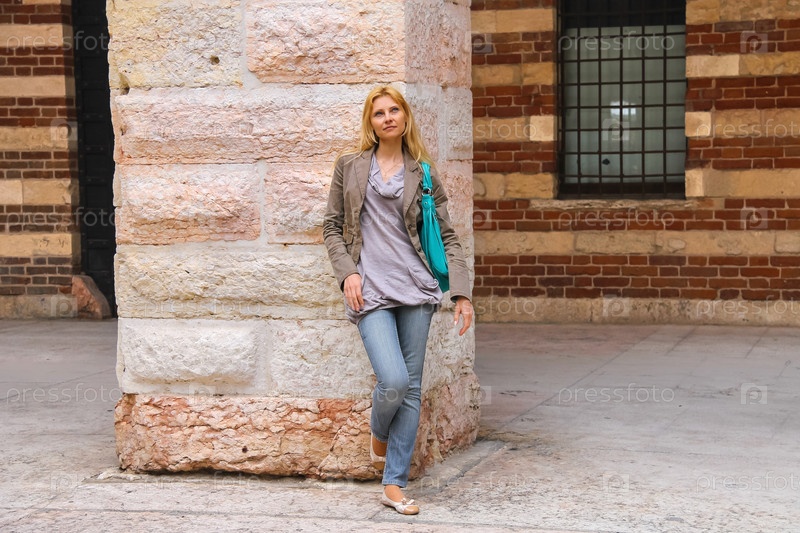 Привлекательная девушка во дворе Палаццо делла Раджионе, Верона, Италия