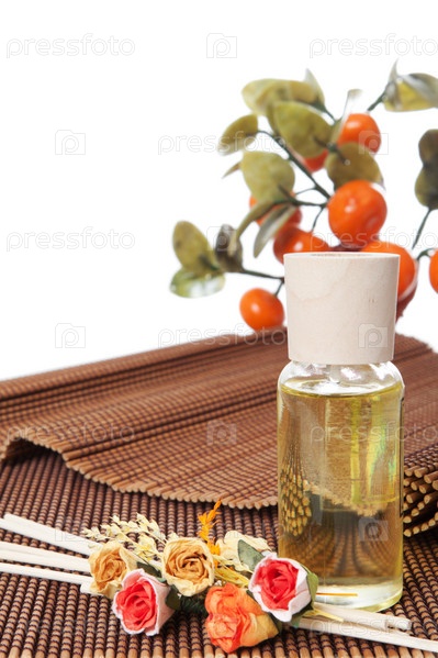 Бутылочка с маслом и сухие цветы на белом фоне