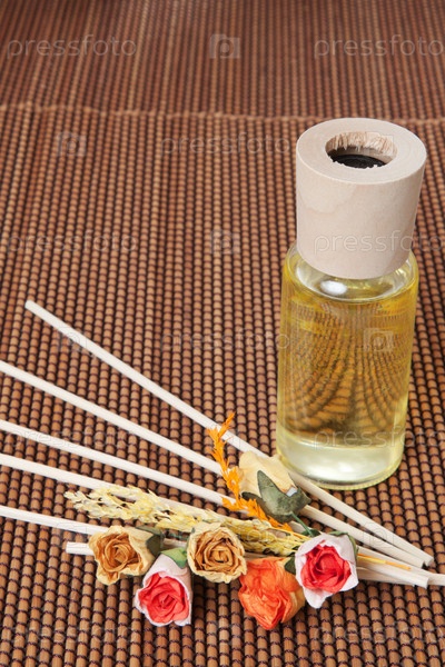 Бутылочка с маслом и сухие цветы на бамбуковой скатерти