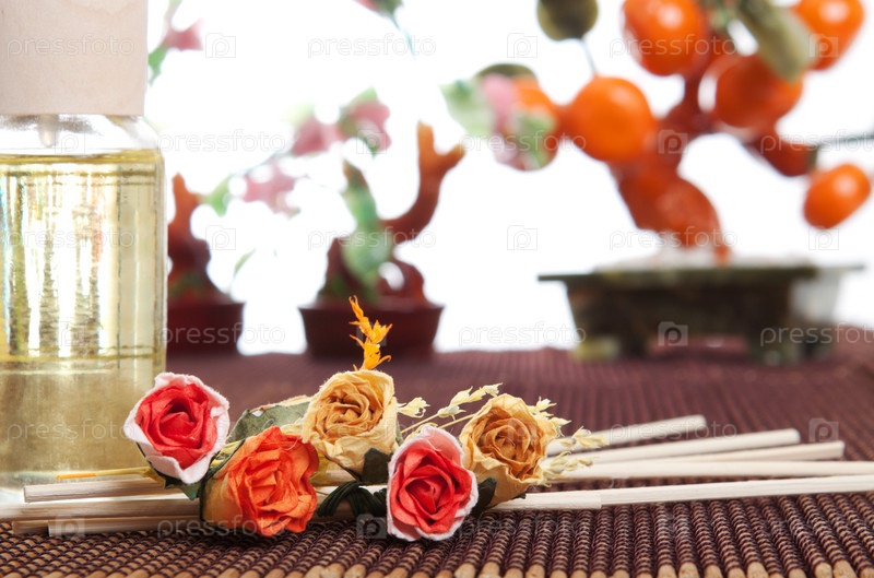 Бутылочка с маслом и сухие цветы на бамбуковой скатерти