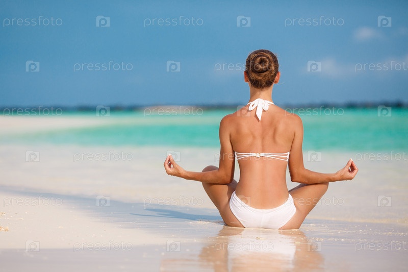 Женщина занимается йогой на пляже
