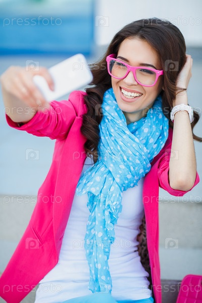 Красивая молодая женщина фотографирует себя на телефон