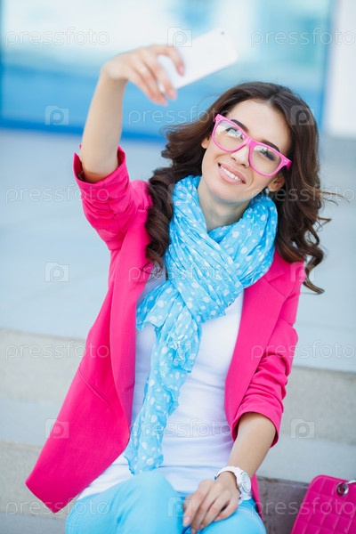 Красивая молодая женщина фотографирует себя телефоном