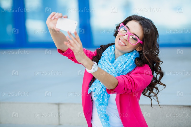 Красивая молодая женщина фотографирует себя телефоном