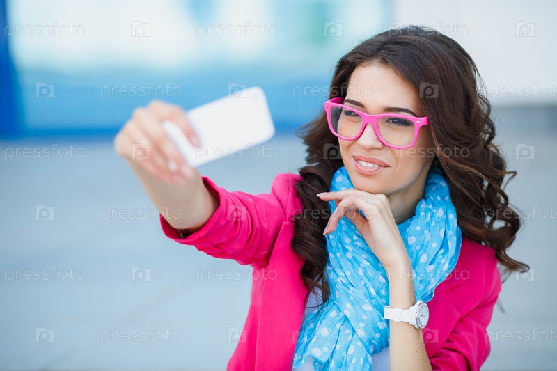 Красивая молодая женщина фотографирует себя телефоном