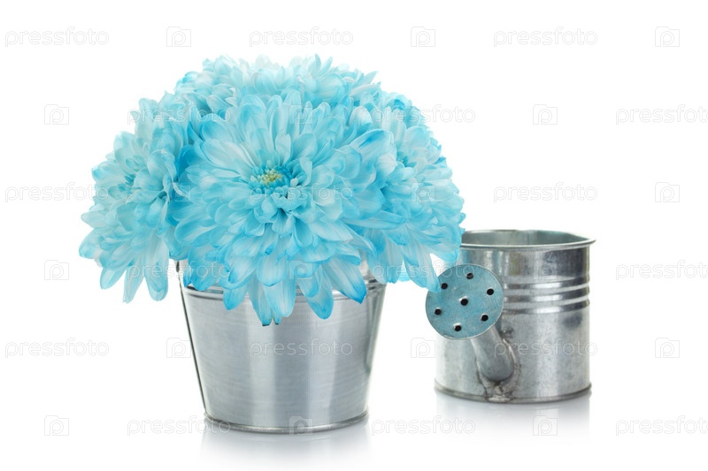 Букет из синих хризантем в стальном ведре и железная лейка на белом фоне