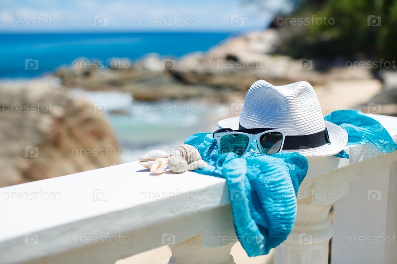 Солнцезащитные очки на пляже на фоне синего океана