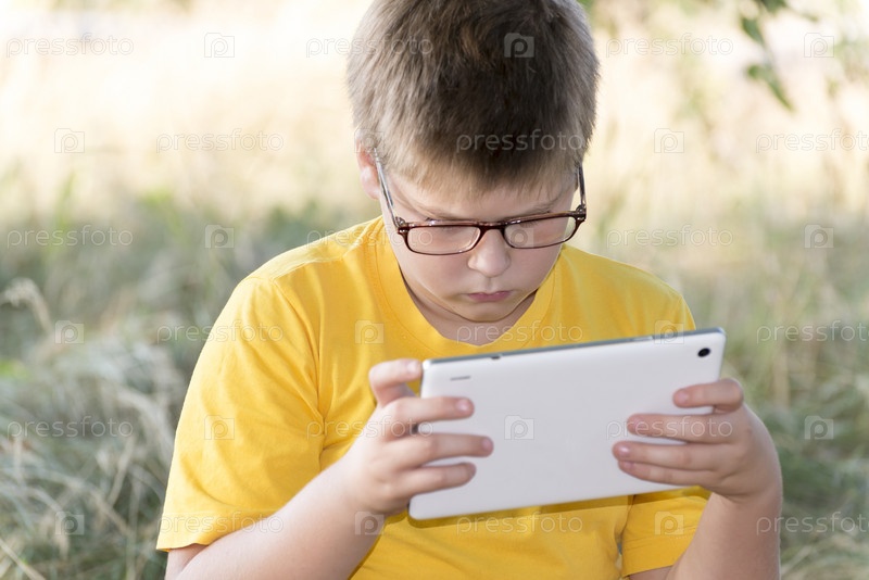 Мальчик в очках с планшетным компьютером на природе