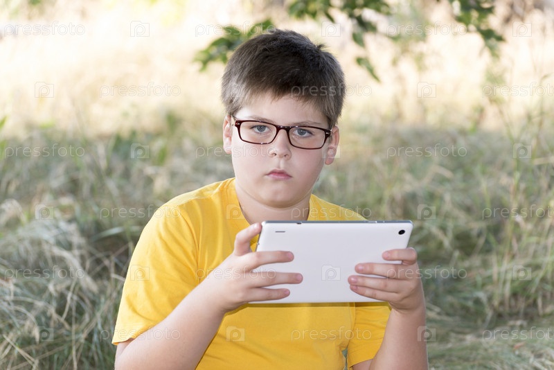 Мальчик в очках с планшетным компьютером на природе