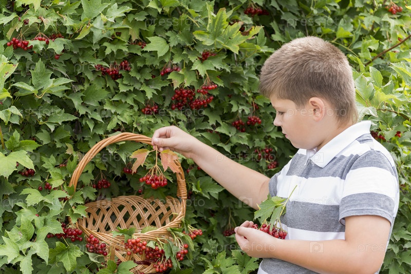 Мальчик собирает калину в саду