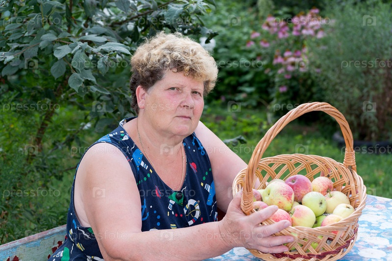 Пожилая женщина с корзиной яблок в саду