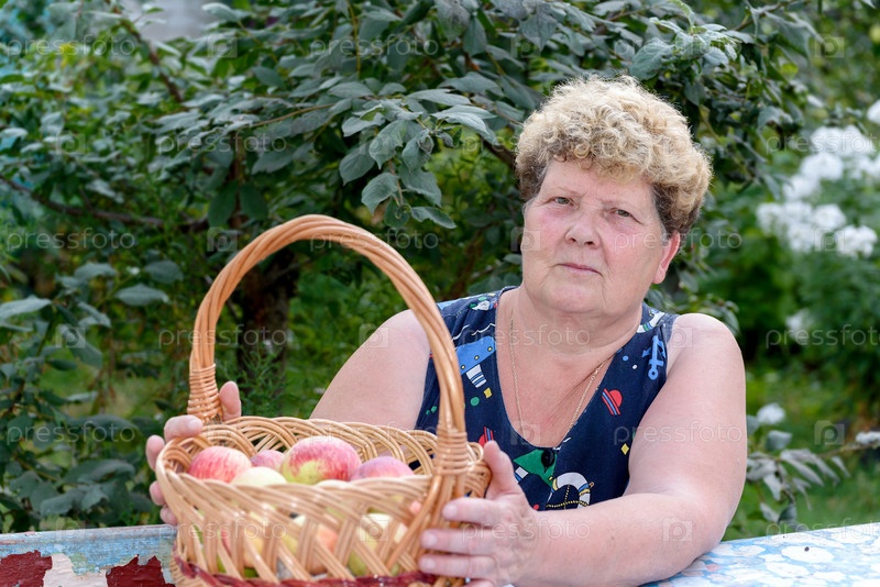 Пожилая женщина с корзиной яблок в саду