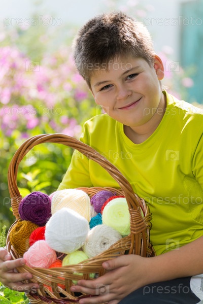 Мальчик подросток с корзиной пряжи