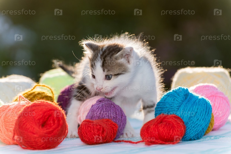 Белый котенок в клубках