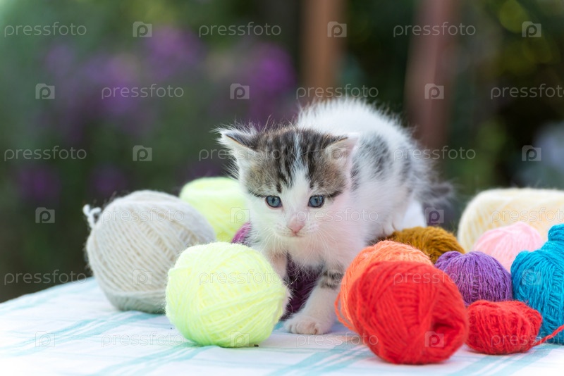 Белый котенок в клубках
